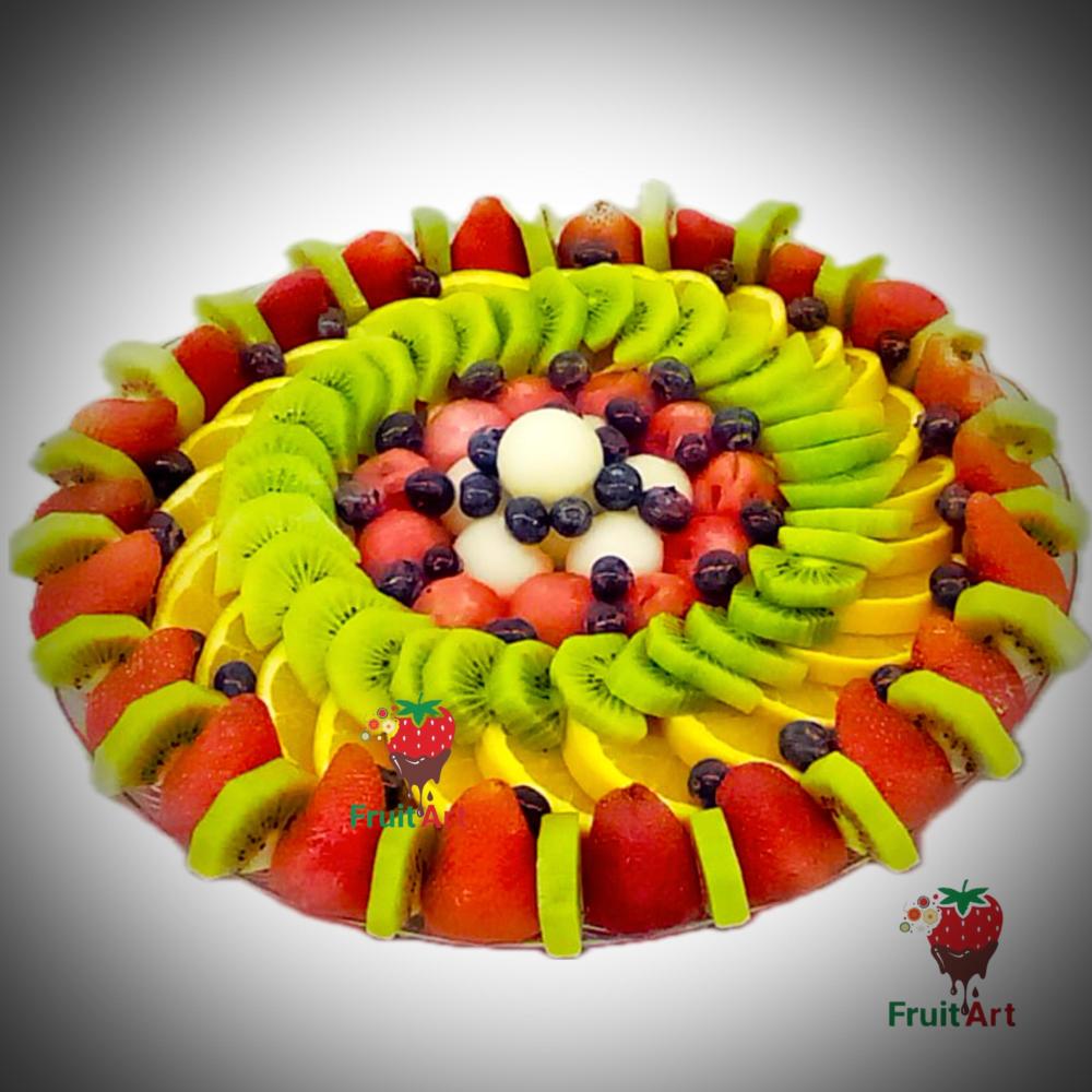 *صحن من الفواكه الطازجة اللذيذة يحتوي على ( شمام ، كيوي ، فراولة ، توت احمر وتوت بلوبيري ، برتقال ، توت احمر و اسود ) تكفي 15 فرد